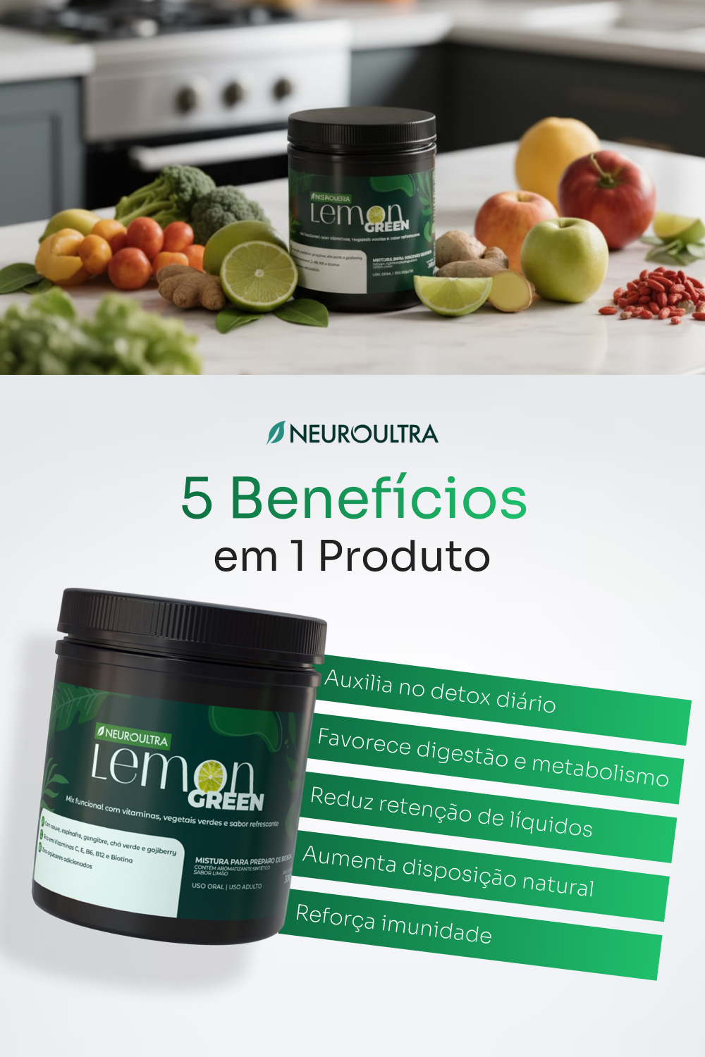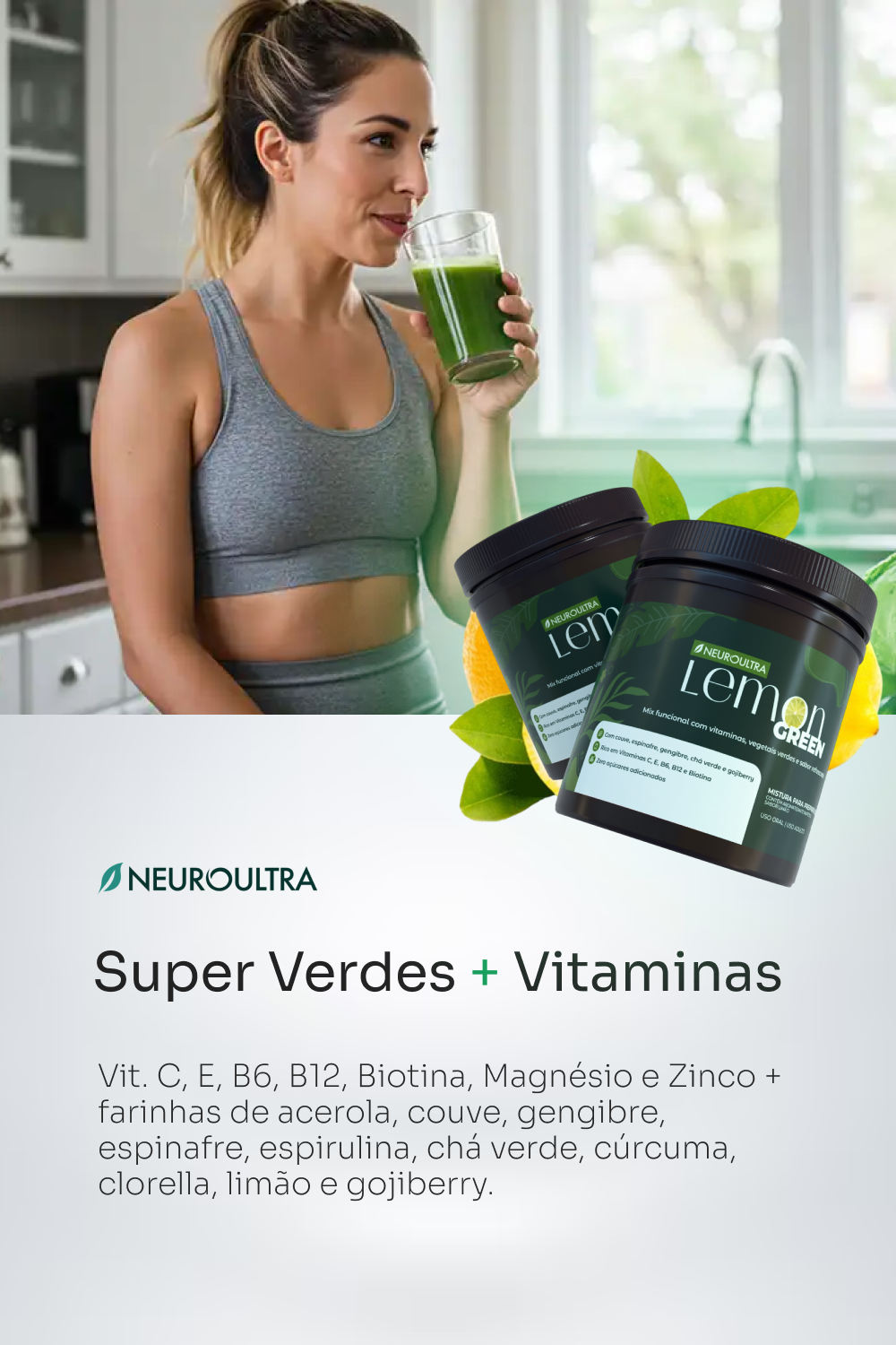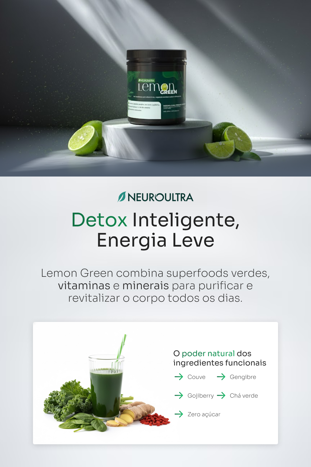 O Lemon Green Neuroultra é um suplemento detox funcional em pó, desenvolvido com blends vegetais e vitaminas essenciais que ajudam a revitalizar o corpo e proporcionar energia leve no dia a dia.