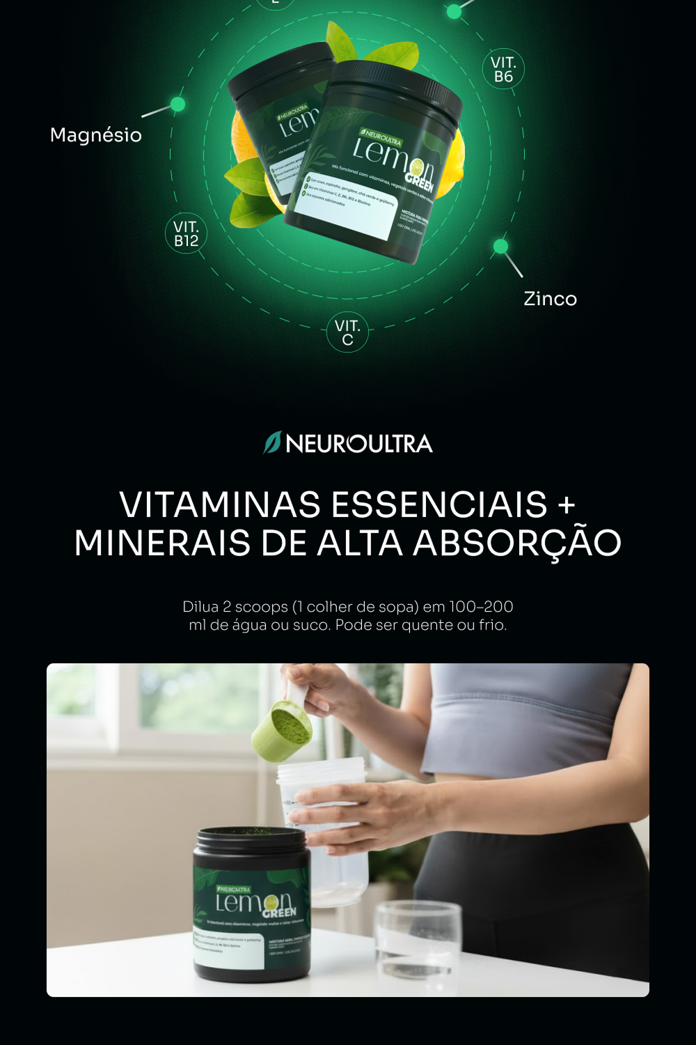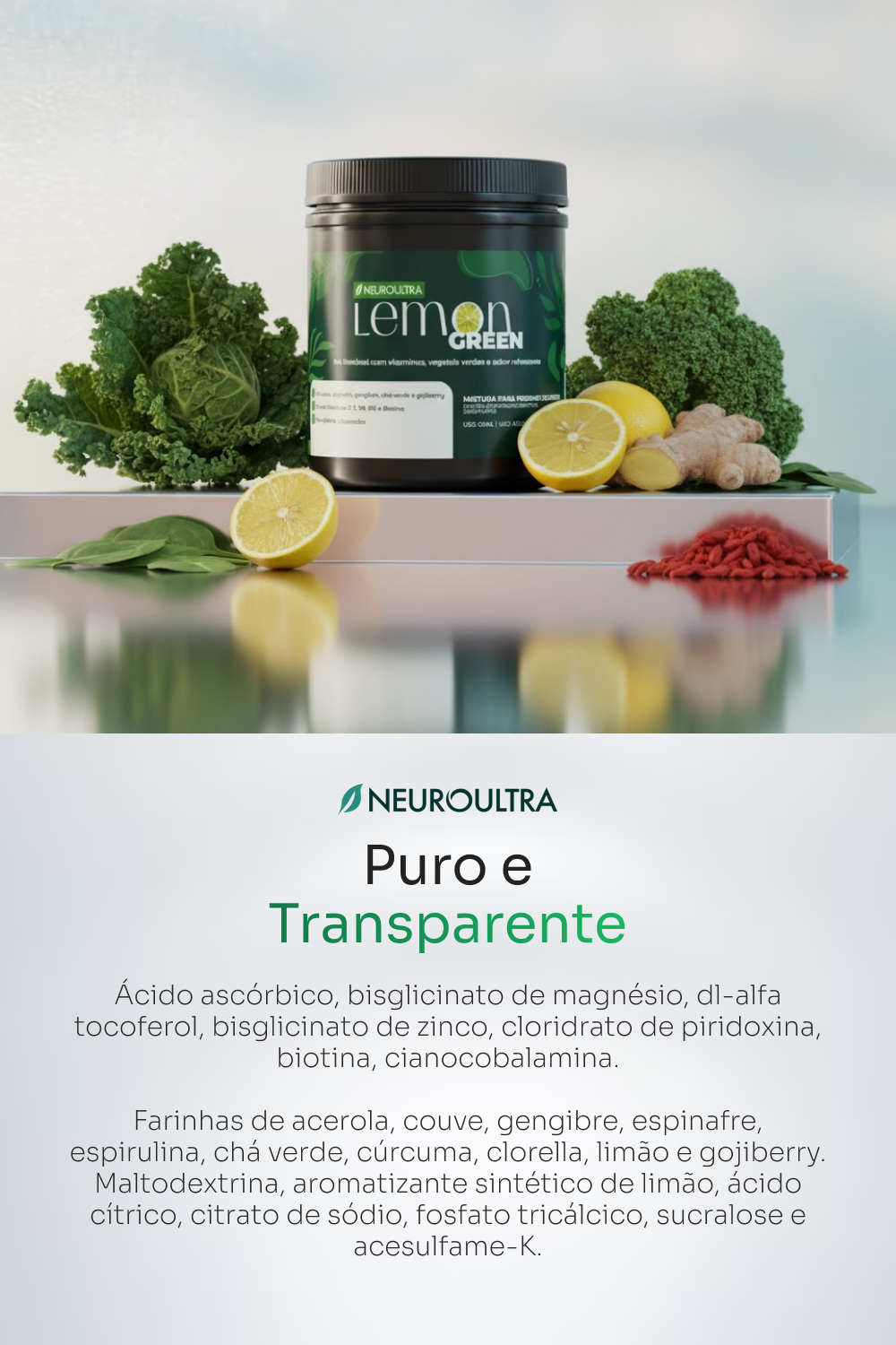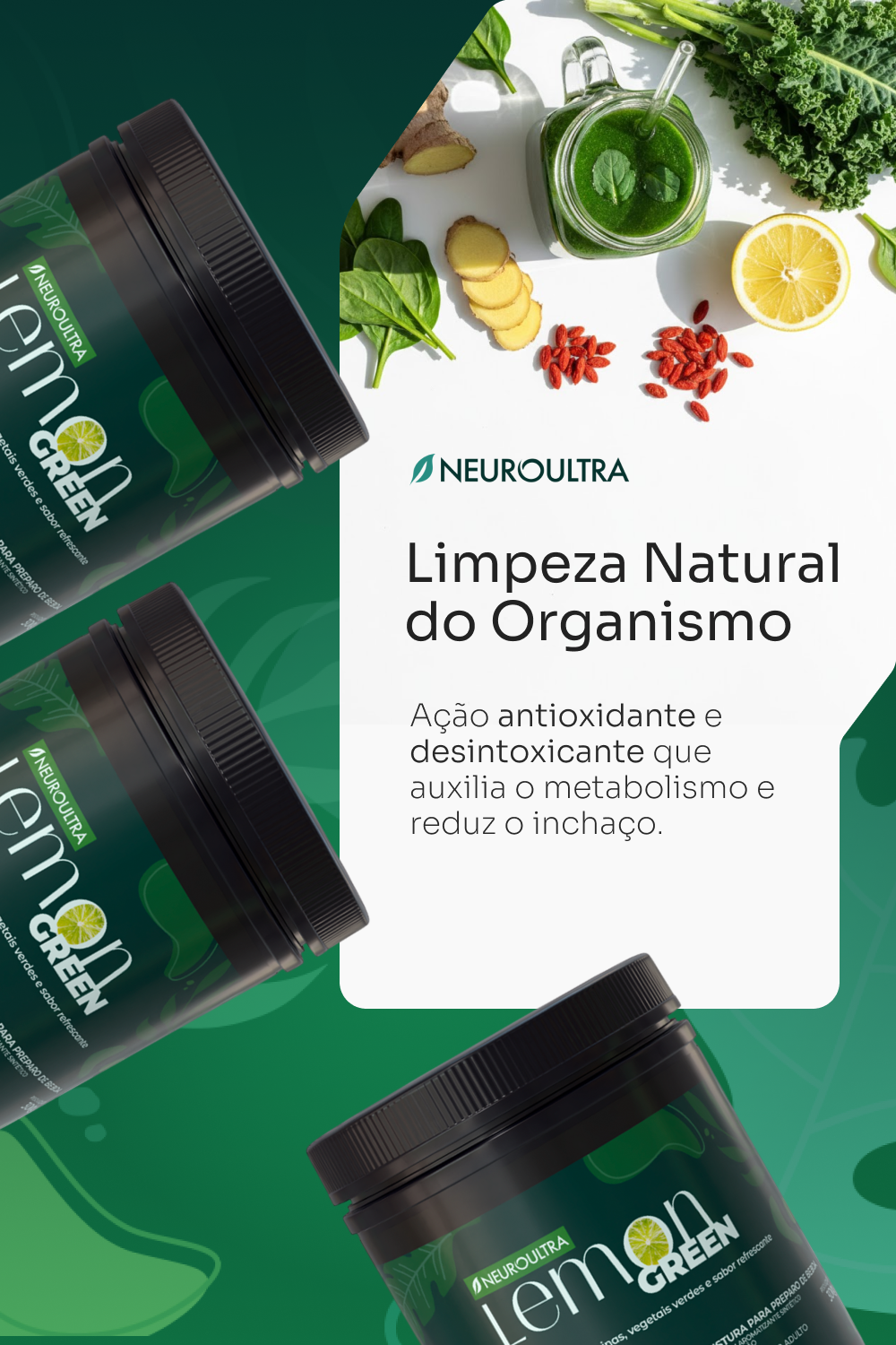O Lemon Green Neuroultra é um suplemento detox funcional em pó, desenvolvido com blends vegetais e vitaminas essenciais que ajudam a revitalizar o corpo e proporcionar energia leve no dia a dia.