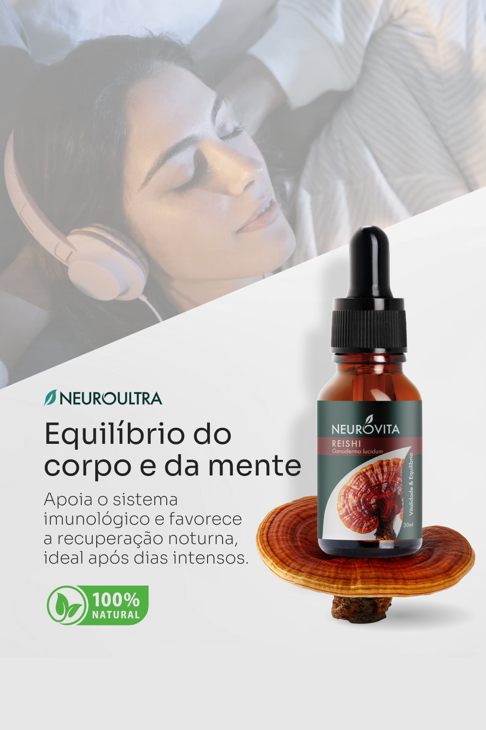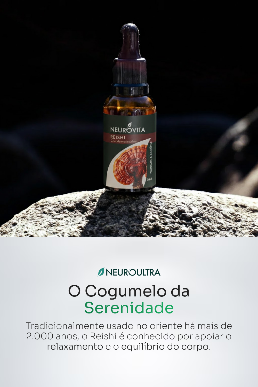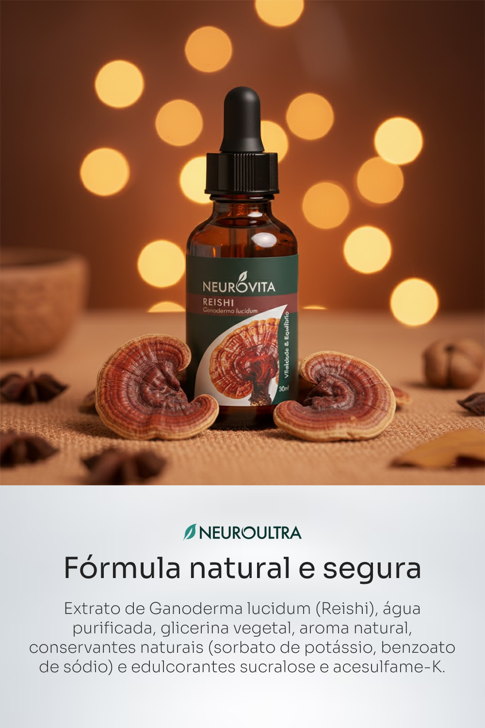 Reishi Neuroultra é o aliado natural para desacelerar e restaurar seu equilíbrio. Produzido com o cogumelo Ganoderma lucidum (Reishi), tradicionalmente usado para promover relaxamento, reduzir o estresse e melhorar a qualidade do sono — sem causar sedação.